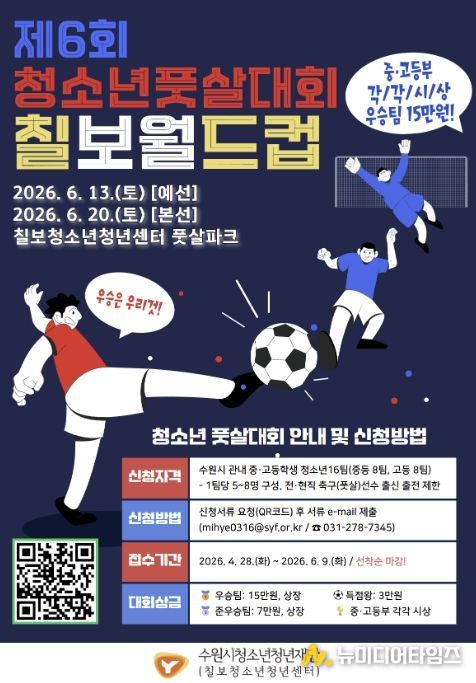수원시청소년청년재단 칠보청소년청년센터는 오는 6월 13일(예선)과 20일(본선), 양일간 센터 내 풋살파크에서 녪. 청소년 풋살대회 [제6회 칠보월드컵]’을 개최한다고 밝혔다.