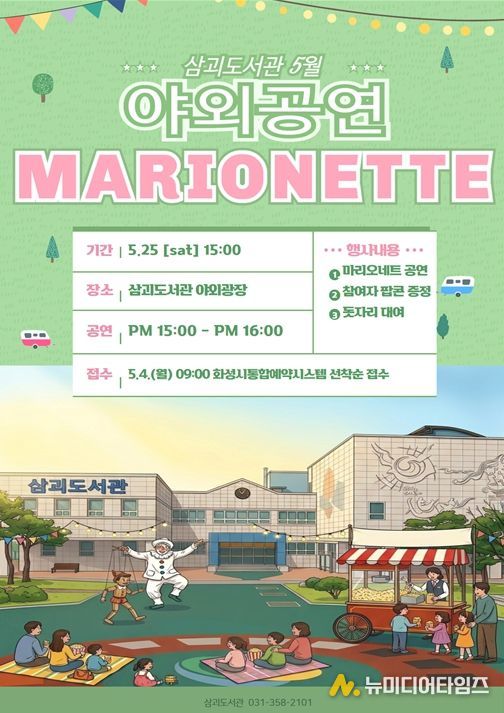 같은 날 '삼괴도서관 팝콘데이'를 운영해 야외광장을 방문하는 이용자들에게 무료 팝콘을 제공한다. 공연과 함께 즐기는 먹거리는 가족 단위 이용자들에게 더욱 풍성한 즐거움을 더하며, 봄날의 도서관 야외 공간을 한층 활기차게 만들 예정이다.