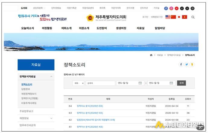 특히 정책 이슈는 ▲체육, ▲경제·노동, ▲교통·환경 등 분야별 제주 지역 주요 현안을 중심으로 심층 분석 형태로 제공되고 있으며, 입법정보는 회기별 주요 조례 제·개정 사항 및 타 시도의최신 입법 사례를 담고 있다.