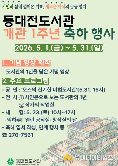 동대전도서관 관계자는 “지난 1년 동안 동대전도서관을 아끼고 찾아주신 시민 여러분께 감사드린다”라며 “이번 1주년 기념행사를 계기로 도서관이 단순히 책을 읽는 공간을 넘어 지역 주민들의 삶에 영감을 주는 독서 문화 공간으로 자리매김하길 바란다”라고 말했다.