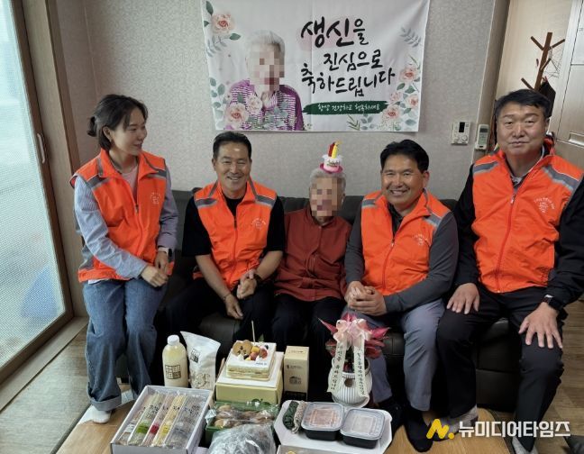 이날 강연식 단장, 김윤태 부단장, 김경일 동장 및 직원들이 함께 방문해 협약기관인 아산시사회적기업협의회에서 후원받은 케이크·떡·밑반찬 등 10종과 행복키움 후원금으로 마련한 생신 선물, 온양5동 청년회가 후원한 축하화분으로 생신상을 차렸다.