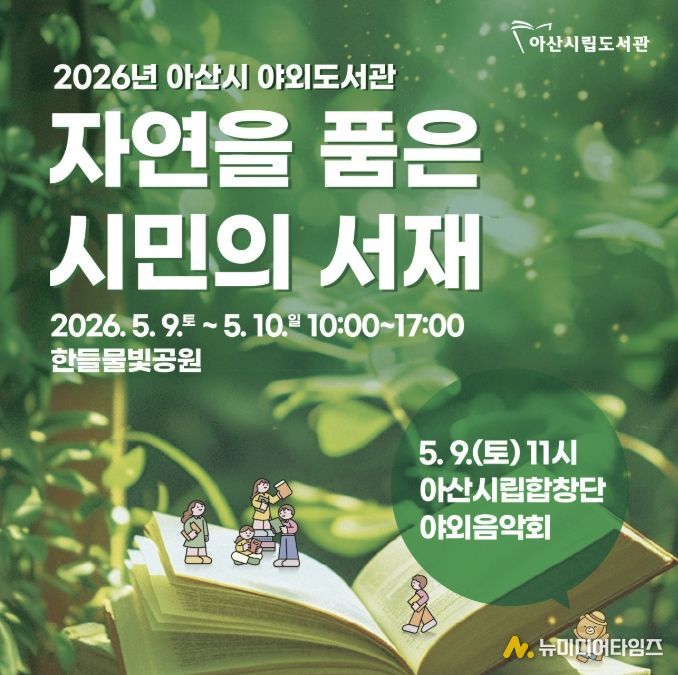 아산시립도서관은 오는 5월 9일부터 10일까지 한들물빛공원 일원에서 야외도서관 '자연을 담은 시민의 서재'를 운영한다.