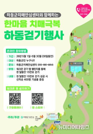 하동군 치매안심센터는 오는 5월 1일부터 30일까지 한 달 동안 치매에 대한 인식 개선을 위해 ‘한마음 치매극복 걷기 챌린지’를 운영한다고 밝혔다.
