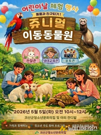 충북 괴산군은 어린이날을 맞아 오는 5월 5일 괴산군청소년문화의집에서 온 가족이 함께 즐길 수 있는 생태 체험 행사 ‘쥬니멀 이동동물원’을 운영한다고 30일 밝혔다.