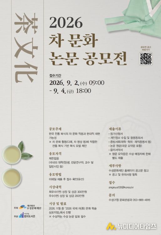 대구 수성문화재단 범어도서관은 한국 차 문화 속 복식의 방향성을 탐색하고, 향후 차 문화 기반 시설에서 활용 가능한 복식 모델을 구체화하기 위해 ‘2026 차(茶) 문화 논문 공모전’을 개최한다.