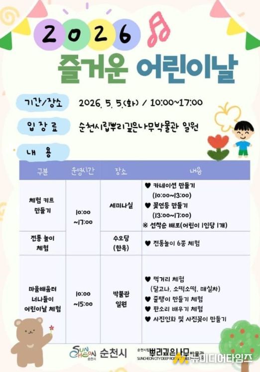 순천시는 오는 5월 5일 순천시립뿌리깊은나무박물관에서 자라나는 새싹들을 위한 ‘2026 즐거운 어린이날’ 문화행사를 개최한다.