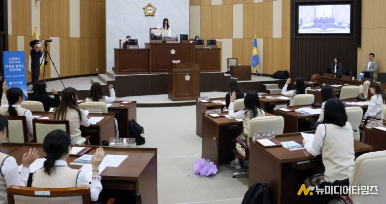 이날 학생들은 모의 임시회를 열고, 7명의 청소년 의원이 ▲교권침해 ▲촉법소년 제도 ▲청소년 선거권 ▲근무시간 문제 ▲인턴제의 문제 ▲최저임금 문제 ▲임금 격차 해소에 대해 자유 발언을 통하여 현실적 문제의식과 참신한 시각을 공유했다.