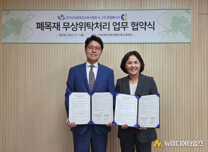 안양과천교육지원청이 관내 학교에서 발생하는 폐목재와 임목폐기물의 무상 처리를 위한 ㈜천일에너지와 업무협약을 체결하며 행정업무 경감, 예산 절감, 자원순환경제 기여라는 1석 3조의 효과를 실현한다고 발표했다.