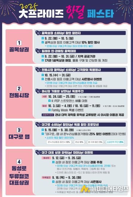 이 같은 소상공인 매출증대 효과를 이어가고 정부의 민생회복 정책의 승수효과를 극대화하기 위해, 대구시는 9월 15일부터 신규 편성예산 21억 원과 기존 가용예산 4억 원 등 총 25억 원 규모의 재원을 투입해 자체 대규모 소비촉진 행사인 ‘2025 大프라이즈 핫딜 Festa’를 개최한다.