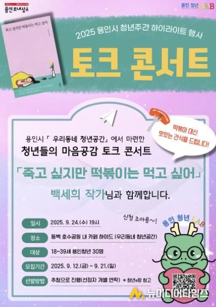 용인특례시는 오는 24일 ‘죽고 싶지만 떡볶이는 먹고 싶어’의 저자 백세희 작가를 초청해 토크 콘서트를 개최한다고 16일 밝혔다.
