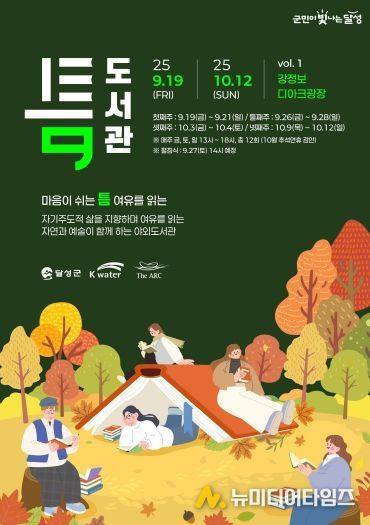 야외도서관 ‘틈’은 ‘마음이 쉬는 틈, 여유를 읽는 틈, 그리고 빈틈’을 주제로 9월 19일부터 10월 12일까지 총 12회 운영된다. 달성대구현대미술제가 진행 중인 강정보 디아크 광장에서 함께 개최되며, 운영시간은 오후 1시부터 6시까지다.