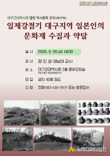 (재)대구문화예술진흥원 박물관운영본부 소속 대구근대역사관은 광복 80주년 기념 연속 특강으로, 9월 26일 ‘일제강점기 대구지역 일본인의 문화재 수집과 약탈’을 주제로 제37회 열린 역사 문화 강좌를 개최하며 참가자를 모집한다.