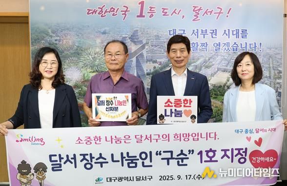 이태훈 달서구청장은 “소중한 나눔을 몸소 실천해 주신 신차분 어르신께 깊이 감사드린다”며 “이번 『장수 나눔인 구순』 지정을 계기로 어르신들의 삶이 존중받고, 더 건강하고 행복한 지역사회로 도약하길 기대한다”고 말했다.