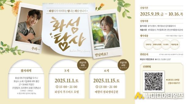 참가 대상은 화성특례시에 주민등록 주소를 두거나 화성시 내 소재한 기업체, 자영업체, 공공기관 등에 재직 중인 27세부터 39세 이하(1998년생~1986년생)의 직장인 미혼남녀이다.