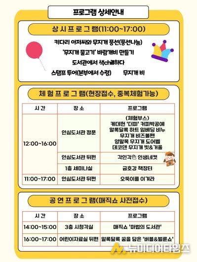 축제 주요 프로그램으로는 아이들의 상상력을 자극하는 ‘마법의 도서관’ 매직쇼와 꿈과 희망을 담은 버블&벌룬쇼가 펼쳐지며, 도서관 주변에는 ▲책 속 주인공 ‘무지개 물고기’ 바람개비 만들기 ▲풍선키다리아저씨와의 만남 ▲스탬프 투어 ▲각인각色 인생네컷 촬영 등 다채로운 체험을 할 수 있는 부스도 마련될 예정이다.