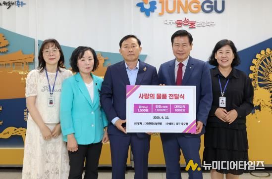 대구 중구는 사단법인 한국나눔연맹(대표 안지애)가 지난 22일 대구 중구청을 방문해 추석 명절을 맞아 백미(10kg) 1,000포, 라면(12개입) 1,000박스, 간식(쌀과자 50봉) 1,000박스 등 이웃돕기 성품을 기탁했다고 밝혔다.