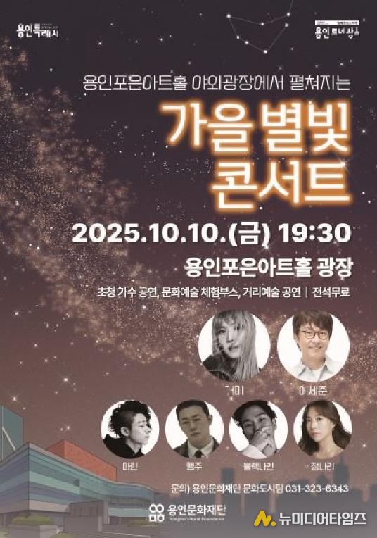 용인문화재단은 오는 10월 10일 오후 7시 30분, 새롭게 단장한 용인포은아트홀 야외광장에서 ‘가을 별빛 콘서트’를 개최한다. 이번 공연은 가을밤의 정취 속에서 시민들에게 특별한 추억을 선사하고, 용인의 대표 광장형 축제를 알리기 위해 마련됐다.