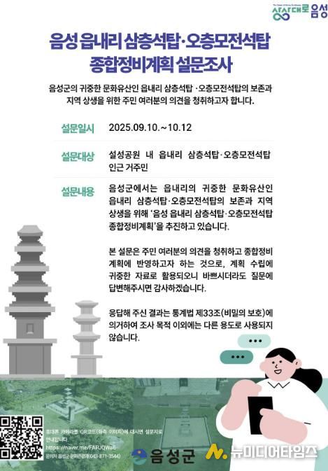 음성군은 읍내리 설성공원 일원에 위치한 ‘음성 읍내리 삼층석탑’ 및 ‘음성 읍내리 오층모전석탑’의 종합정비계획을 수립하는 과정에서 주민 의견 수렴을 위한 온라인 설문조사를 실시한다고 밝혔다.