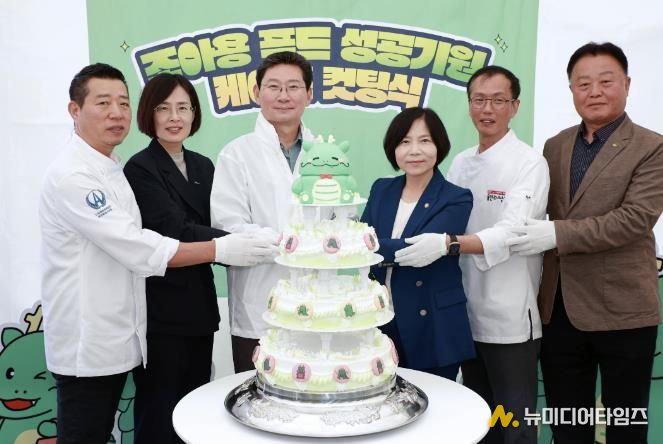 용인특례시는 28일 용인미르스타디움에서 열린 ‘제30회 용인시민의 날’ 행사장에서 시 캐릭터 조아용을 활용한 먹거리의 성공을 기원하는 케이크 컷팅식을 열었다.