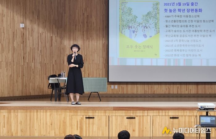 이번 강연은 홍 작가의 저서 『모두 웃는 장례식』을 읽고 삶과 죽음의 의미와 가족의 소중함을 돌아볼 수 있도록 마련됐다. 말기 암을 앓는 할머니가 ‘생전 장례식’을 치르며 가족과 마지막 인사를 나누는 동화를 통해 작가는 장례 문화와 ‘웰다잉’의 의미를 소개하고, “모두 웃는 장례식이 가능할까?”를 주제로 미니 토론을 진행하여 학생들이 스스로 의견을 나누며 생각을 확장할 수 있는 기회를 제공했다.