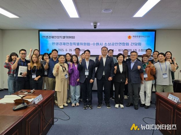 제주특별자치도의회 민생경제안정 특별위원회(위원장 강봉직)는 2025년 9월 29일, 도의회 소회의실에서 수원시 소상공인연합회 윤일영 회장을 비롯한 21명의 임원 및 회원들과 함께 상권활성화 및 민생경제 안정화를 위한 간담회를 개최했다.