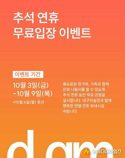 대구문화예술진흥원대구미술관은 추석 당일인 10월 6일 휴관하고, 연휴 기간인 3일부터 9일까지 무료 개관해 시민들의 명절 문화생활을 함께 한다.