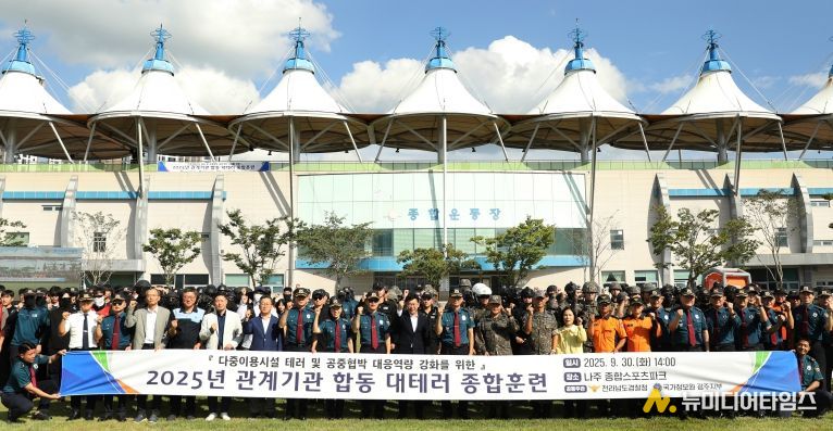 전남경찰청은 나주종합스포츠파크에서 국가정보원(광주지부), 육군 제31보병사단, 제11공수특전여단, 공군 제1전투비행단, 전남소방본부, 영산강유역환경청 등 10개 기관 250여명이 참여한 가운데 관계기관 합동 대테러 종합훈련을 실시했다.