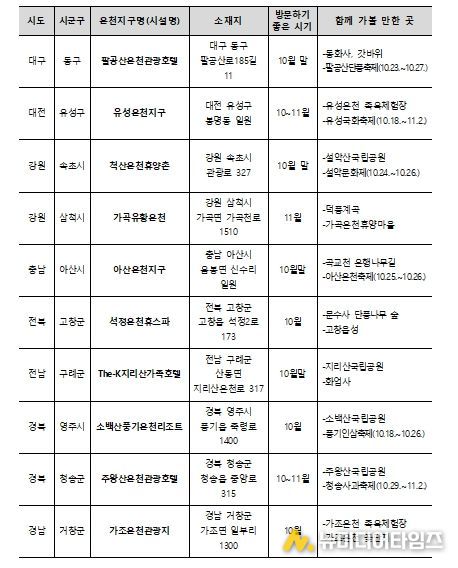 선정된 10곳은 ▲가을 정취를 한껏 느낄 수 있는 단풍명소 인근 온천 8곳과 ▲지역 대표 온천축제와 연계해 체험할 수 있는 온천 2곳이다.