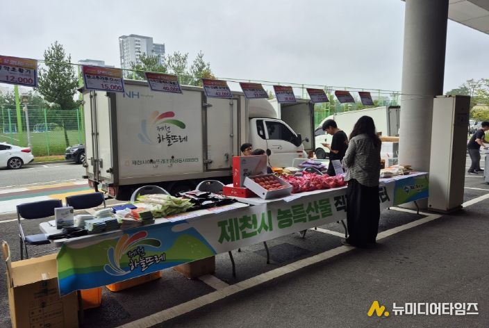 제천시는 지난 9월 30일 충북 오송단지에서 열린 식품의약품안전처 주관 직거래장터에 지역 농산물 판매업소 ‘하늘뜨레’와 함께 참여해, 오송단지 내 6개 입주기관 직원과 주민 등 2,000여 명을 대상으로 지역 특산품을 판매했다.