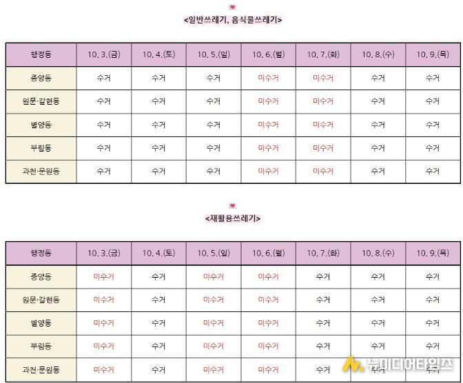 생활폐기물 수거는 일반 쓰레기의 경우 3일, 4일, 5일, 8일, 9일에, 재활용 쓰레기는 4일, 7일, 8일, 9일에 각각 수거된다.