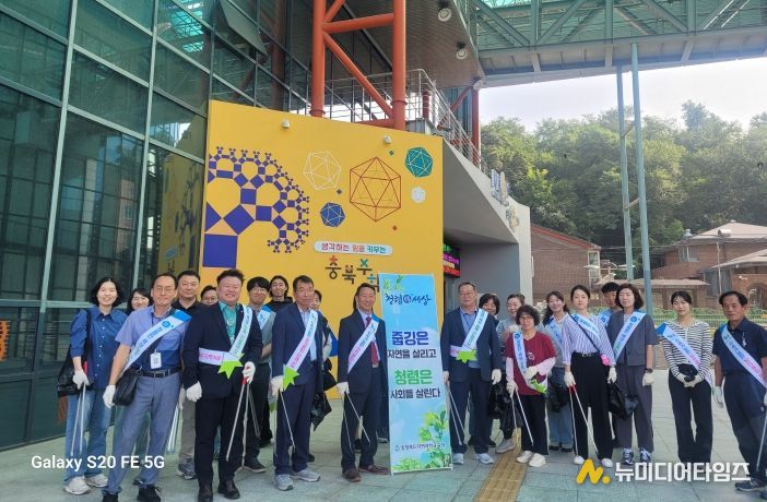 충청북도교육청 직속기관 자연과학교육원(원장 지성훈)은 1일, 당산공원에서 10월 직원 소통의 날 행사로 '청렴캠페인 겸 줍킹(Plogging) 환경정화 활동'을 전개한 뒤 오후에는 육거리전통시장을 찾아 명절맞이 장보기 행사에 전 직원이 동참했다.