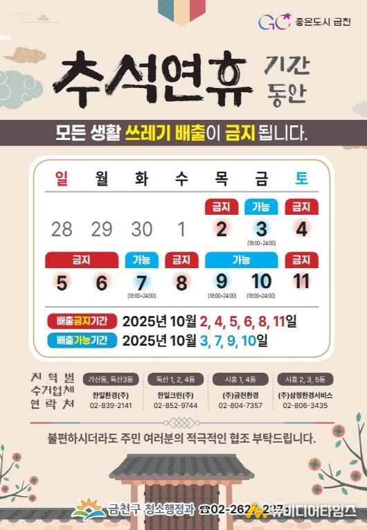 금천구는 추석 연휴 기간 생활쓰레기(일반생활쓰레기, 음식물쓰레기, 재활용품) 수거를 일시 중단한다고 밝혔다.