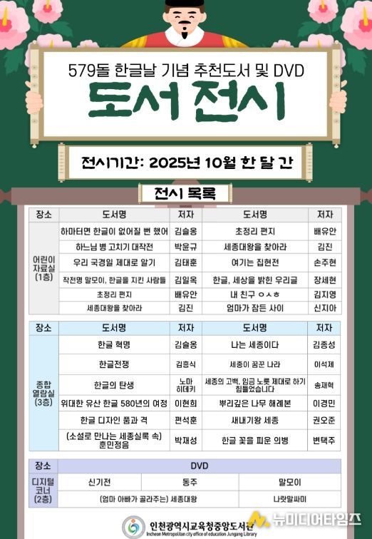 인천광역시교육청중앙도서관은 한글 창제 579돌을 기념해 10월 한 달 동안 ‘한글날 추천 도서 및 DVD’ 전시를 운영한다.