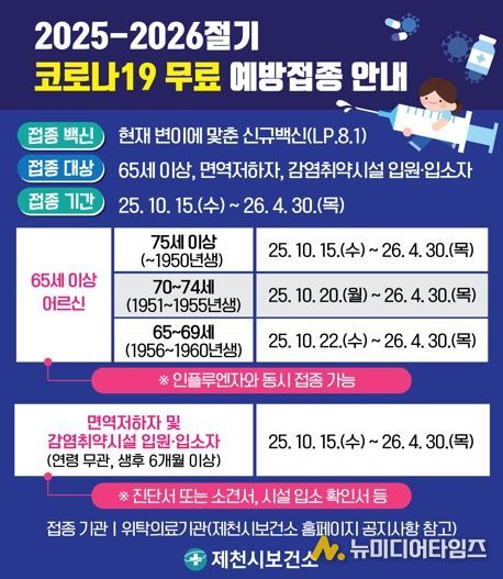 제천시는 오는 15일부터 65세 이상 어르신, 생후 6개월 이상 면역저하자, 감염취약시설 입원․입소자를 대상으로 신규 코로나 백신(LP.8.1)을 활용해 코로나19 무료 예방접종을 실시한다.