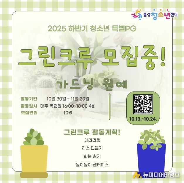 음성청소년센터는 하반기 청소년 특별 프로그램인 ‘그린크루 모집 중!’을 운영한다고 13일 밝혔다.
