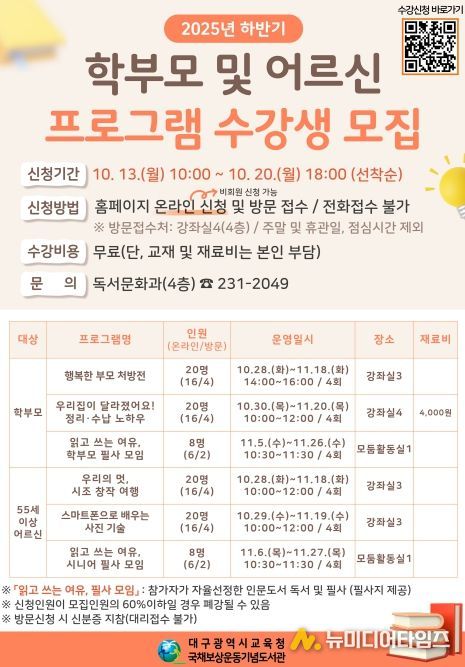 어르신 대상으로는 ▲시조를 이해하고 창작해 보는 ‘우리의 멋, 시조 창작 여행, 스마트폰 카메라 활용법’, ▲사진 편집 방법을 익힐 수 있는 ‘스마트폰으로 배우는 사진 기술’ 프로그램을 운영한다. 또한, ▲학부모 및 어르신 대상 자율 선정한 인문도서를 필사하는 ‘읽고 쓰는 여유, 필사 모임’을 진행한다.