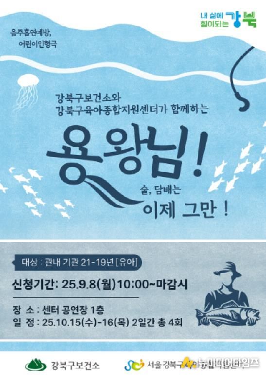 행사는 인수동에 위치한 강북구 육아종합지원센터 1층 공연장에서 진행되며, 오전 10시 20분과 11시 20분 일 2회씩 총 4회 공연으로 구성된다. 인형극 제목은 ‘용왕님 술, 담배는 이제 그만’으로, 술과 담배로 건강을 잃은 용왕님이 자라 경호원과 토끼의 도움으로 금연과 절주의 중요성을 깨닫고 회복하는 이야기다.