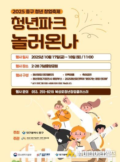 대구 중구는 청년창업가와 지역 주민이 함께 어울릴 수 있는 교류의 장을 마련하고자 2025년 중구 청년창업 축제 '청년파크 : 놀러온나'를 오는 10월 17일부터 18일까지 양일간 2·28기념중앙공원에서 개최한다고 밝혔다.