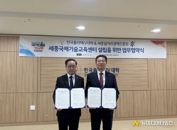 세종일자리경제진흥원과 한국폴리텍Ⅳ대학은 13일 한국폴리텍Ⅳ대학 대전캠퍼스에서 ‘세종국제기술교육센터’ 설립 및 운영을 위한 업무협약을 체결했다.