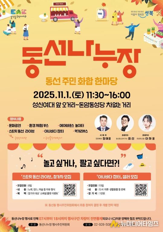 서울 성북구는 오는 11월 1일 오전 11시 30분부터 오후 4시까지, 성신여대 앞 오거리에서 돈암동성당 구간까지 이어지는 거리에서 ‘2025년 차 없는 거리 동선나누장’ 행사를 개최한다고 밝혔다.