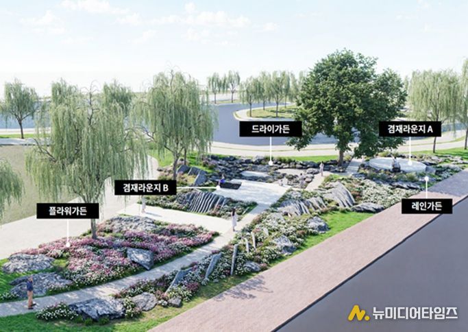낙동강의 기존 왕버들·능수버들을 배경으로, 선을 형상화한 인공 구조물을 설치했으며, 그 사이에 하천에서 잘 자라는 억새, 수크렁 등 초화류 1,600본과 용버들, 나무수국 등 수목 105주를 식재해 자연과 예술이 조화를 이루는 정원을 연출했다. 특히 정원 한가운데 자리한 큰 버드나무 아래에는 ‘겸재 라운지’가 마련되어 있어, 잠시 쉬어가며 마치 산수화 속에 들어온 듯한 풍경을 감상할 수 있다.