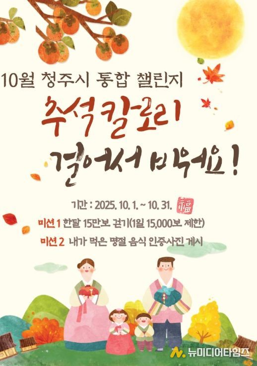 먼저 모바일 걷기 앱 ‘워크온(Walk-On)’을 활용해 청주시민 누구나 참여할 수 있는 ‘추석칼로리 걸어서 비워요’ 챌린지가 오는 31일까지 진행된다.
