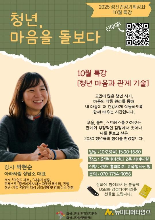 화성시정신건강복지센터가 오는 23일 오후 3시 유앤아이센터에서 2025 정신건강 기획강좌 10월 특강 ‘청년, 마음을 돌보다’를 개최한다.