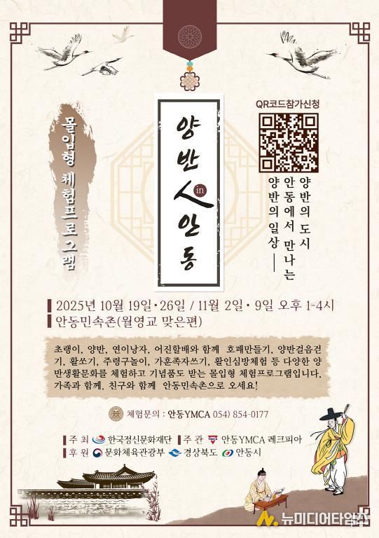 안동민속촌 일원에서 진행되며, 참여자들이 ‘안동인(人)’으로 살아보는 몰입형 체험 콘텐츠로 구성돼 있다. 매주 일요일 오후 1시부터 4시까지 4주간 운영되며, 사전 신청 또는 현장 접수를 통해 누구나 참여할 수 있다.