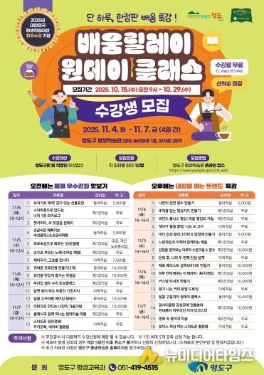 부산 영도구는 ‘대한민국 평생학습대상 최우수상’ 수상을 기념하여 오는 11월 4일부터 7일까지 4일간 영도구 평생학습관(와치로 259)에서 ‘2025 영도구 배움릴레이 원데이 클래스’를 운영하며, 현재 수강생을 모집 중이라고 밝혔다.