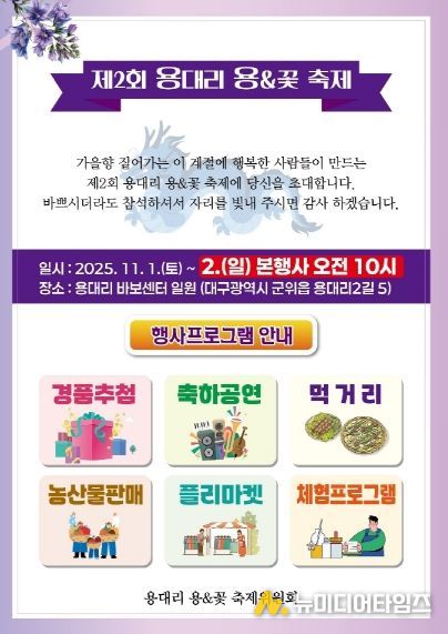 군위읍 용대리(이장 박영석)는 11월 1일부터 2일까지 용대리 바보센터(군위읍 용대2길 5)일원에서 주민 및 방문객과 함께하는 마을축제 ‘제2회 용대리 용&꽃 축제’를 개최한다고 밝혔다.