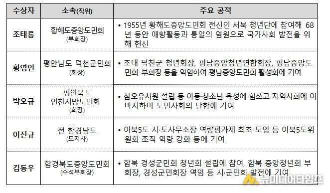 한편, 이번 대회에서는 올해 ‘국가사회발전 이북도민 유공’ 정부포상자로 선정된 39명 중 5명의 유공도민에게 국민훈장 동백장이 수여된다.
