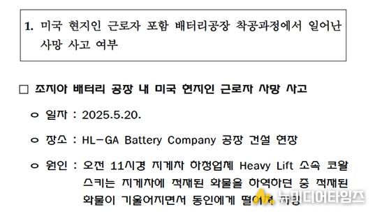 이 의원실이 확보한 현지 정보에 따르면, 해당 공장 건설 과정은 하청·재하청 구조로 인해 안전관리 체계가 크게 약화됐으며, 미국 산업안전보건청(OSHA)에 보고된 산업재해만 70건이 넘었다고 한다. 불법체류 노동자들이 추방을 우려해 신고하지 못한 경우까지 감안하면 실제 사고 건수는 훨씬 많을 것으로 추정된다.