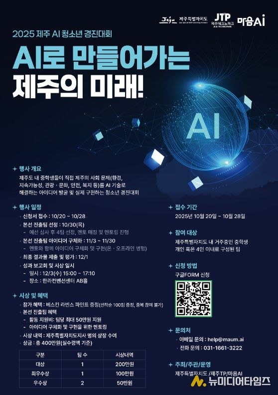 제주특별자치도와 제주테크노파크(원장 지영흔, 제주TP)는 도내 청소년의 AI 이해도 향상과 창의적 문제 해결 역량 강화를 위해 ‘2025 제주 AI 청소년 경진대회’ 참가자를 오는 28일까지 모집한다고 20일 밝혔다.