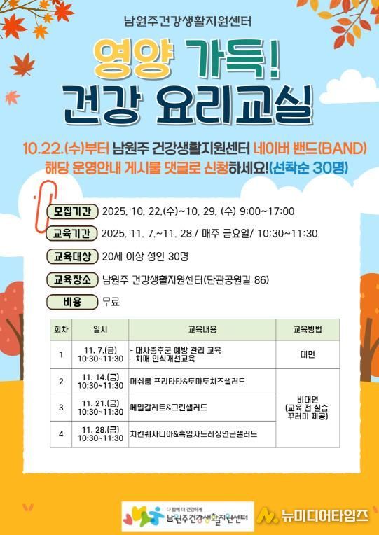 모집 대상은 20세 이상 지역 주민 30명이며, 10월 22일 오전 9시부터 센터 네이버 밴드에 게시된 교육 안내문에 댓글을 달아 신청할 수 있다.